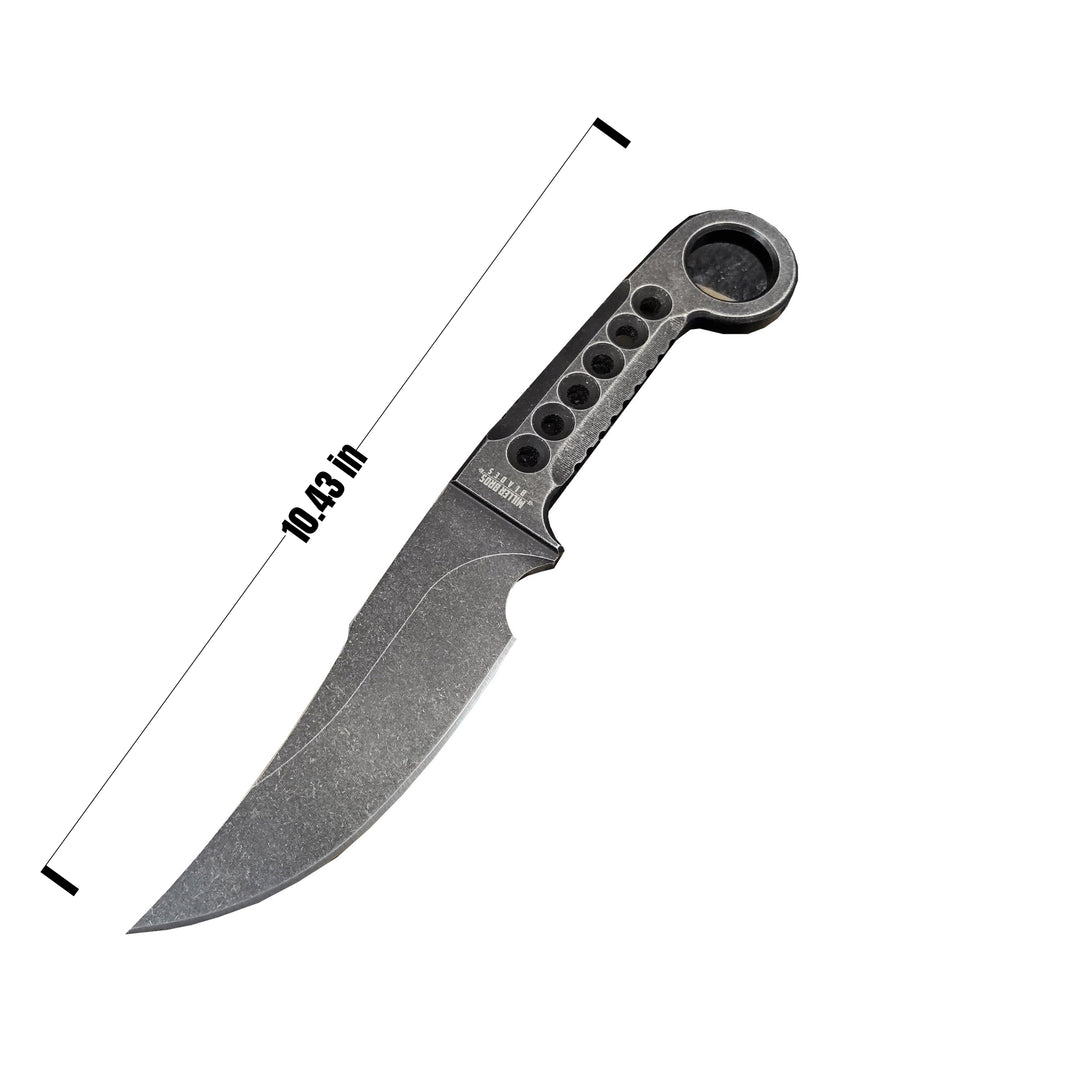 The Miller Dakyr Rhino is not just a knife; it's a testament to superior engineering and artisanal precision. Crafted from premium DC53 steel, renowned for its exceptional hardness and wear resistance, this blade undergoes a meticulous hand-finished secondary bevel process, pushing the boundaries of sharpness. Its full-tang, integrated keel design ensures unparalleled durability and a reassuringly solid feel in hand. Designed for both aesthetic appeal and practical functionality, the ergonomic grip provides comfort and control, while the hollow-out design offers customization opportunities for DIY enthusiasts to personalize with paracord or other adornments, enhancing both beauty and portability.