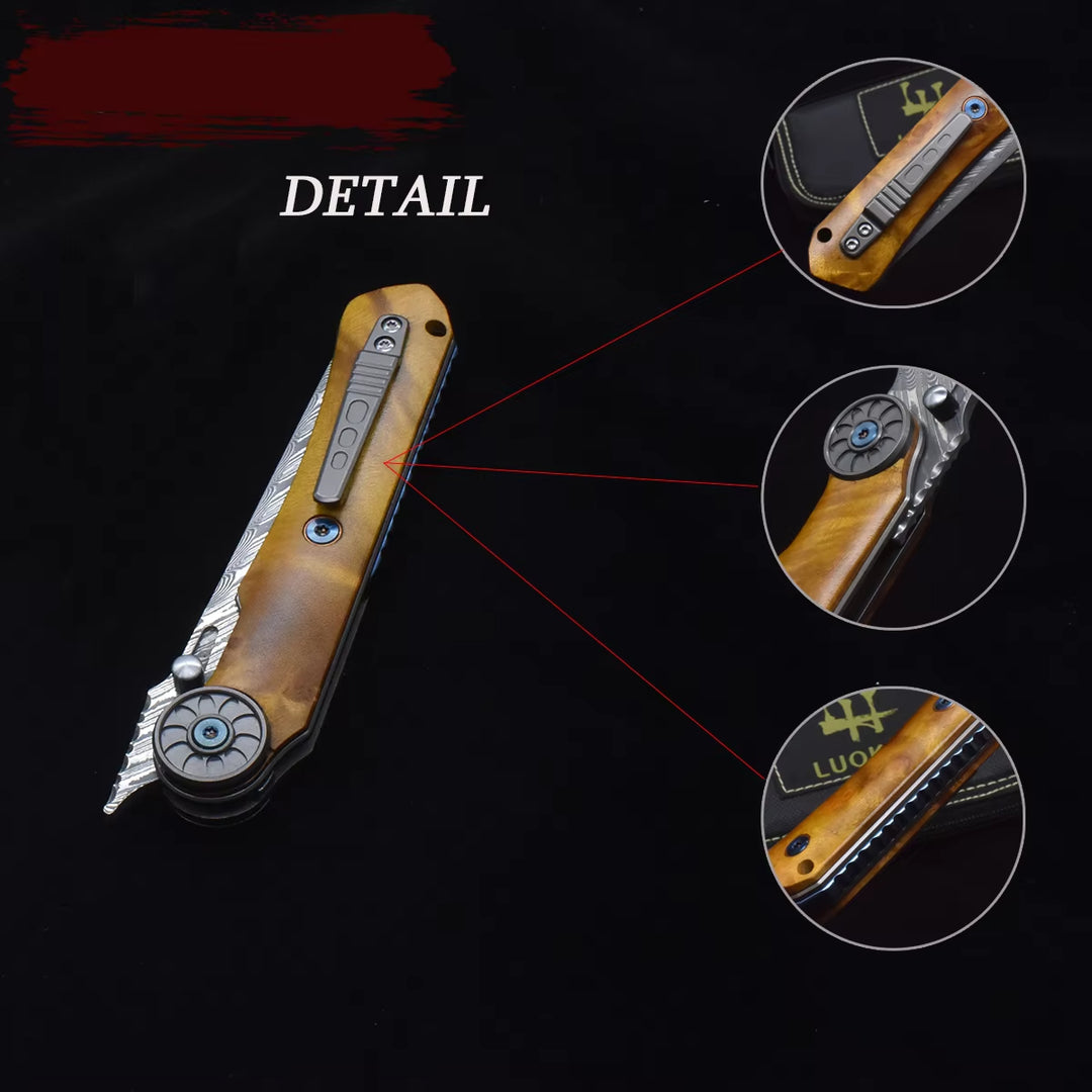 Each blade bears the unique Damascus pattern, symbolizing power and precision. The bearing-folding mechanism delivers fluid, one-hand operation, while the natural wood handle reflects timeless craftsmanship. It’s designed for those who appreciate function wrapped in aesthetic excellence — sharp, portable, and undeniably premium.