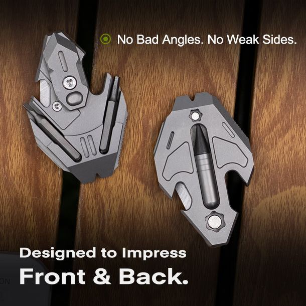 Real EDC should solve problems without adding bulk. The Flounder 3.0 merges cutting, writing, prying, fixing, and survival essentials into a pendant-sized tool you can wear daily without even noticing it. Its two-piece safe blade brings controlled cutting; the powerful magnetic pen works in any environment; and dual driver bits snap into place for quick repairs. Whether you’re opening packages, tightening gear, striking a fire starter, or tackling small emergencies outdoors, this tiny titanium build is proof that minimal carry can still deliver maximum function.