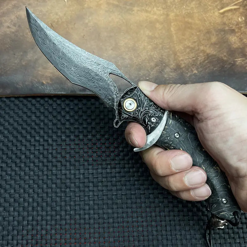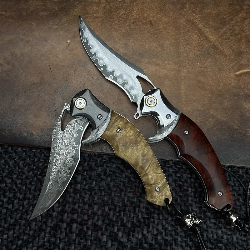 Shadowfang isn’t just another folding knife — it’s a fusion of craftsmanship and engineering. The VG10 damascus steel and tri-layer steel delivers unmatched edge retention and wear resistance, while the hardwood handle offers a warm, natural touch. Every open and close feels deliberate, fluid, and built to last.