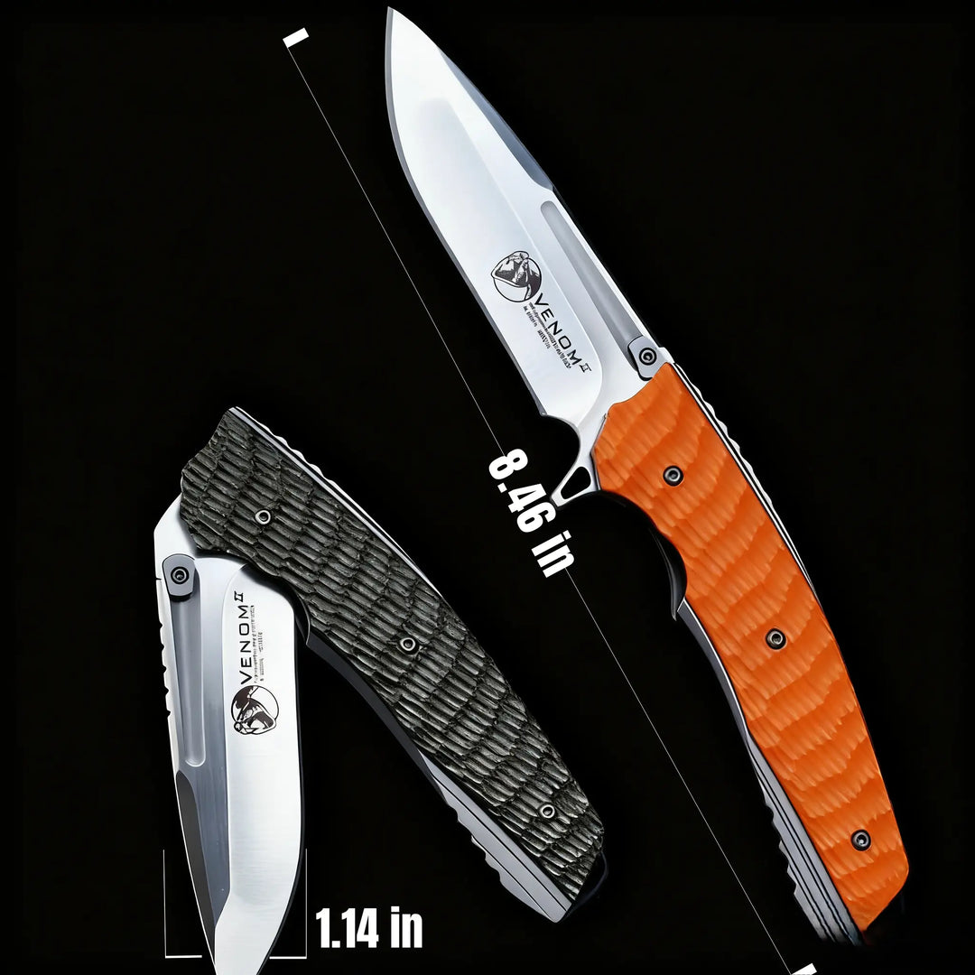 The Venom Viper S35VN Tactical Folding Knife is built for those who demand reliability and performance in every cut. Crafted from premium S35VN steel with a 59–60HRC hardness, it delivers razor-sharp precision and lasting edge retention. The ergonomic G10 and steel handle ensures a secure, anti-slip grip even in tough outdoor conditions. A quality finish that delivers an exceptional experience in both outdoor adventures and everyday tasks.