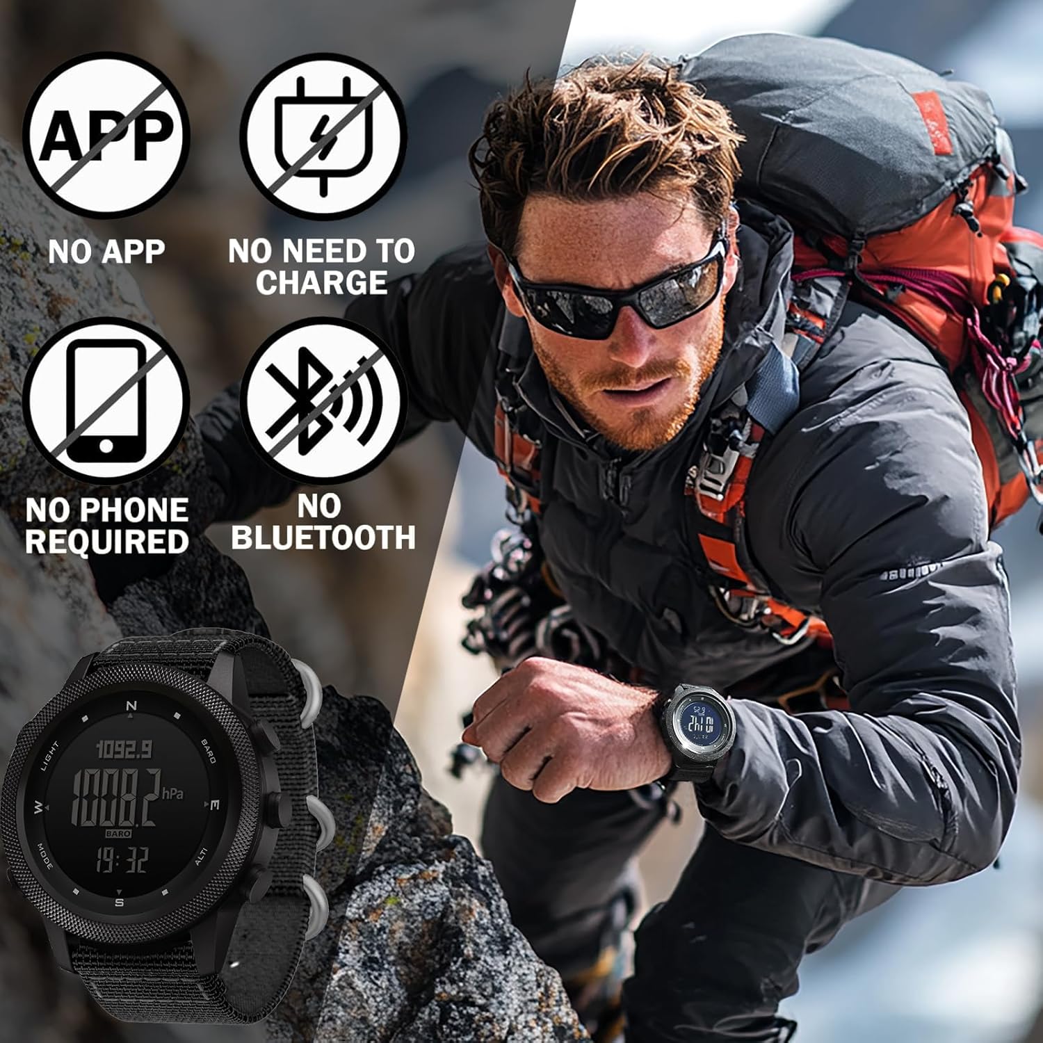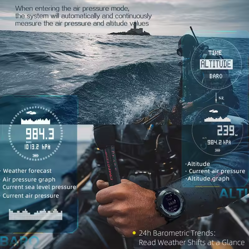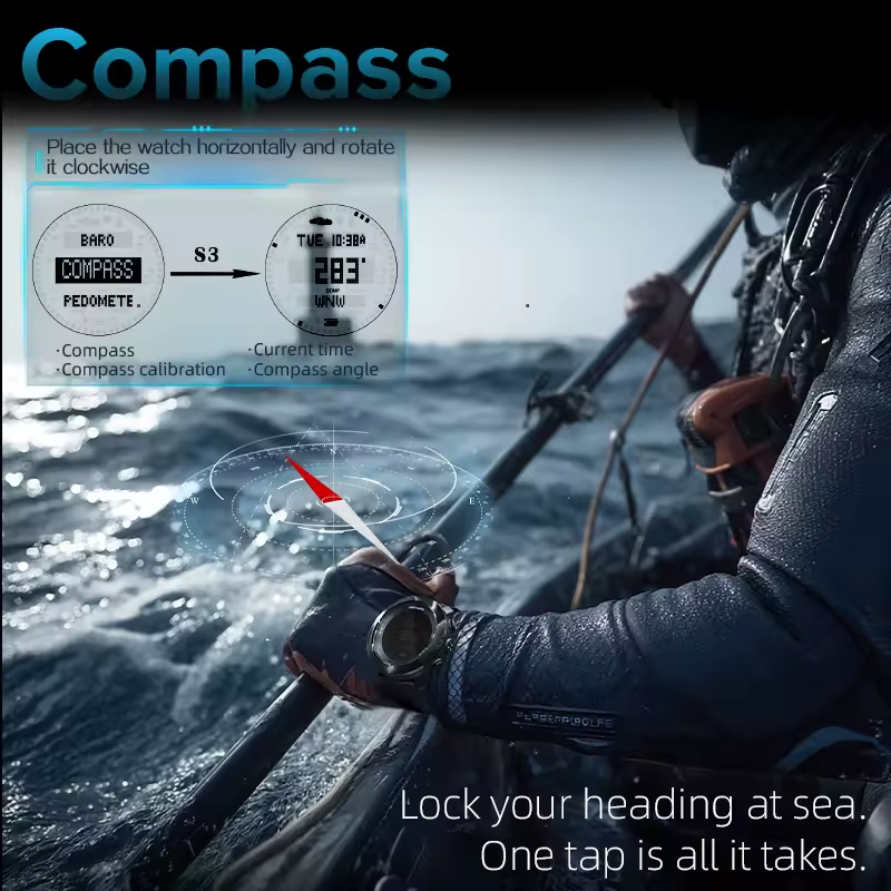 The DepthMaster X is designed with a focus on functionality, durability, and versatility. Inspired by the needs of outdoor enthusiasts and tactical users, the watch combines advanced tools with a rugged, military-grade construction. Its ergonomic design prioritizes comfort without compromising performance, ensuring it can withstand extreme conditions while providing precise measurements and convenience.