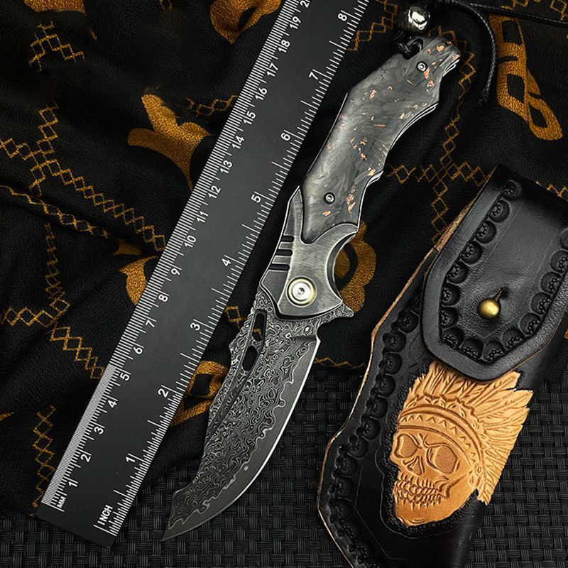 The Eclipse Edge combines VG10 Damascus steel with a hand-finished carbon fiber and copper flake handle, delivering a balance of raw performance and visual elegance. Built for collectors and everyday adventurers alike, this folding knife offers unmatched durability, precision, and aesthetic sophistication.