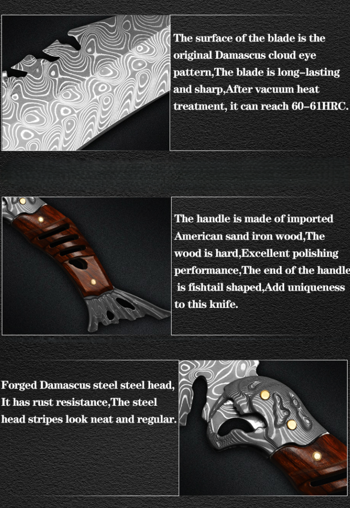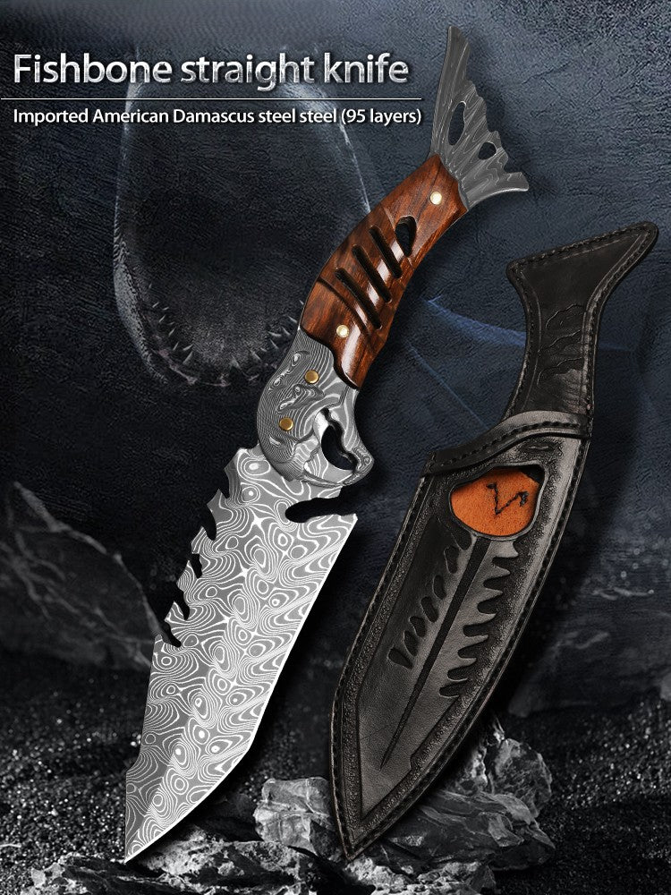 1 × Ironwood Fang Damascus Fishbone Fixed Blade Knife
