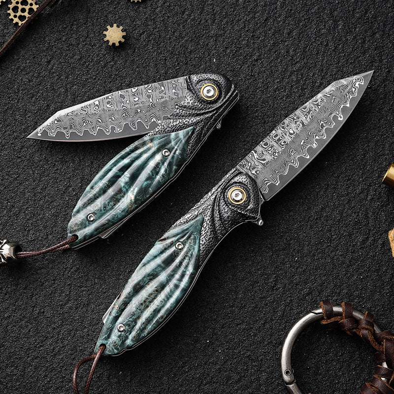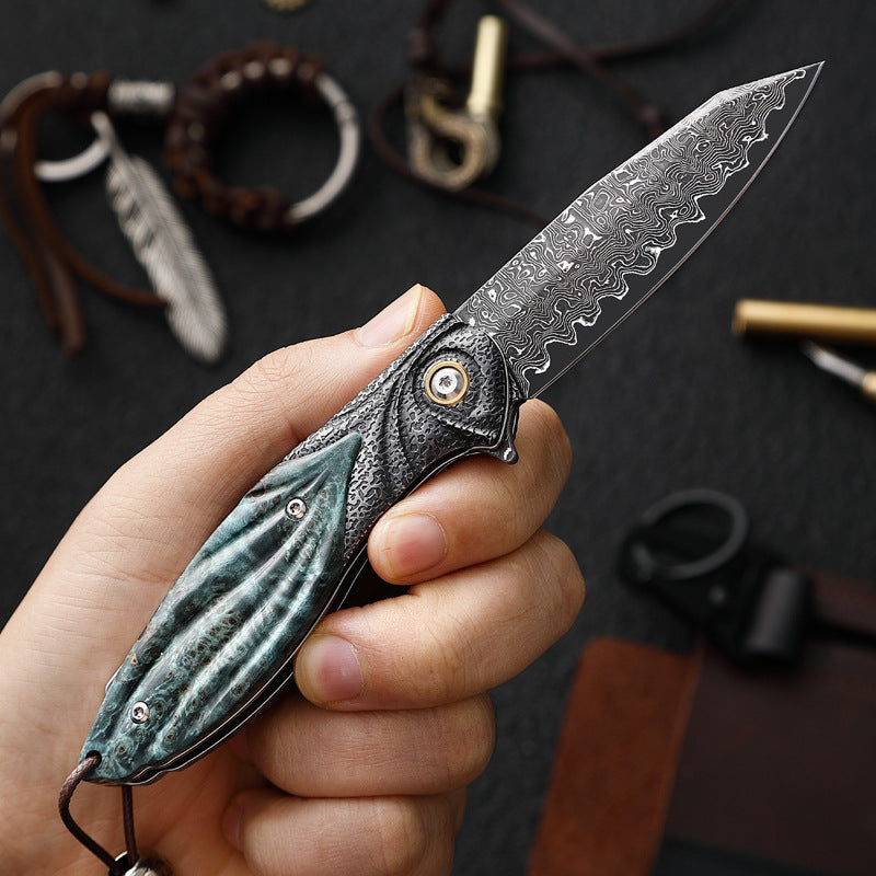 Forged from VG10 Damascus steel and paired with a hand-carved peacock-tail handle, the Peacock Forge blends art and performance in one collectible EDC. Lightweight yet strong, it’s built for both outdoor reliability and everyday sophistication.