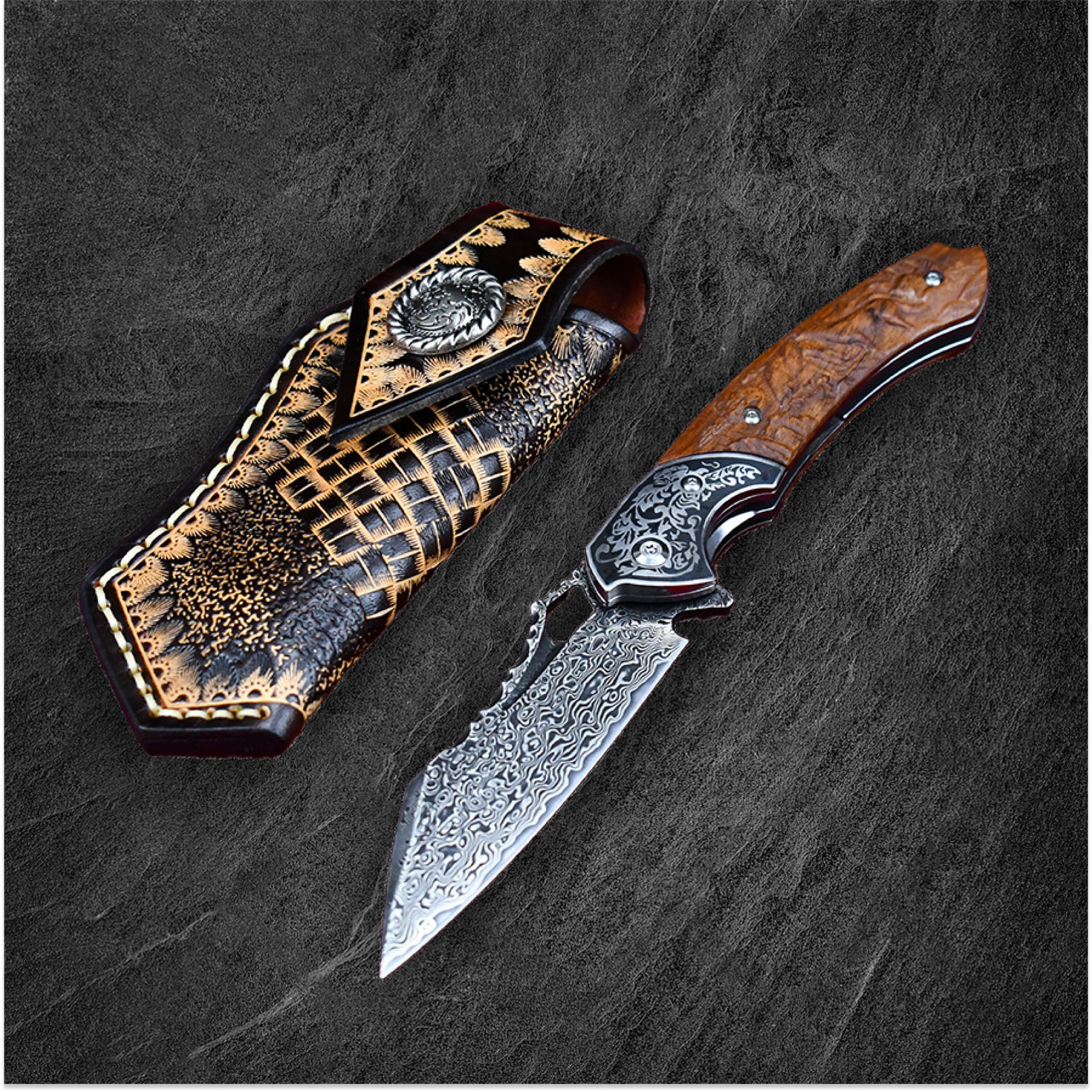 Crafted for those who value precision and artistry, the AetherEdge is a masterfully forged Damascus steel folding knife that blends strength, elegance, and function. Each blade features a unique wave pattern born from layers of VG10 Damascus steel—engineered for lasting sharpness and corrosion resistance. The handle combines imported ironwood with CNC-engraved steel detailing, creating a tactile experience that feels as premium as it looks.